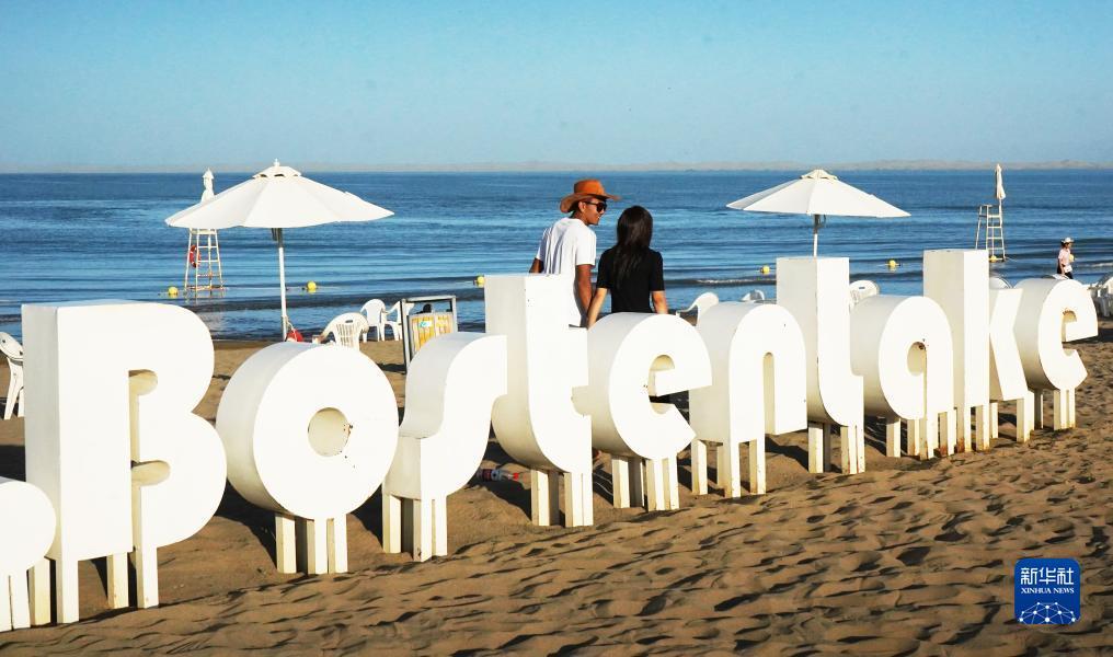 8月31日,游客在新疆博斯腾湖大河口景区游玩。