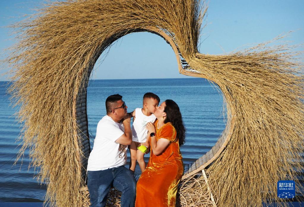 8月31日,游客在新疆博斯腾湖大河口景区拍照。