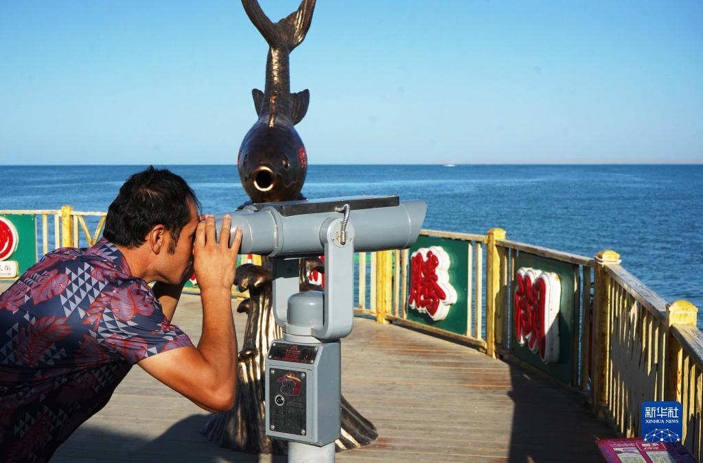 8月31日,在新疆博斯腾湖大河口景区,游客使用望远镜观察远方。