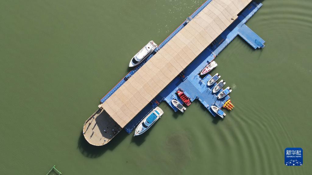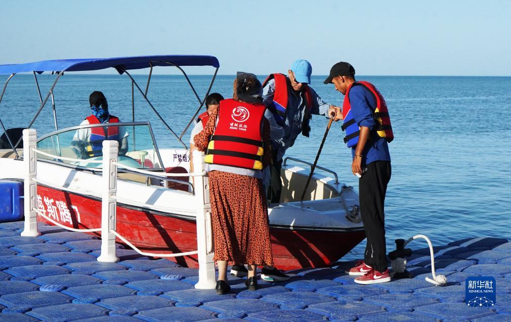 8月31日,在新疆博斯腾湖大河口景区,工作人员帮助乘坐游艇的游客下船。