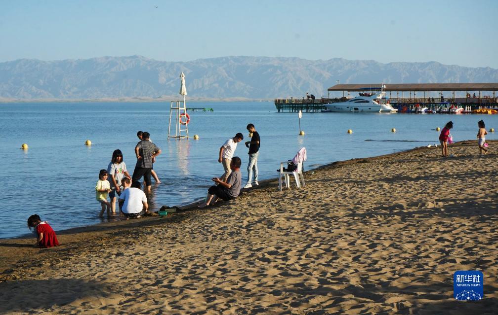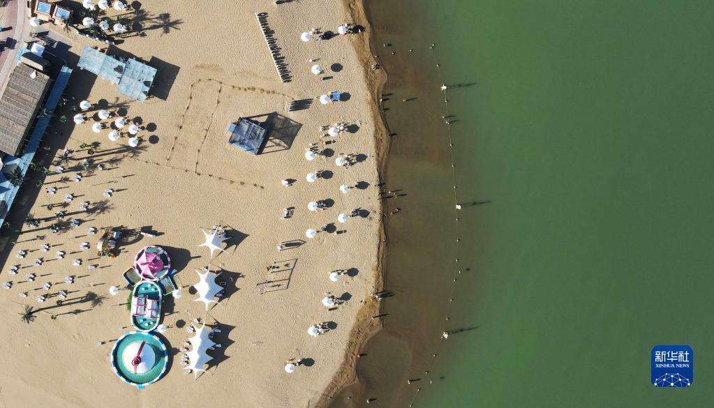 8月31日,游客在新疆博斯腾湖大河口景区游玩(无人机照片)。