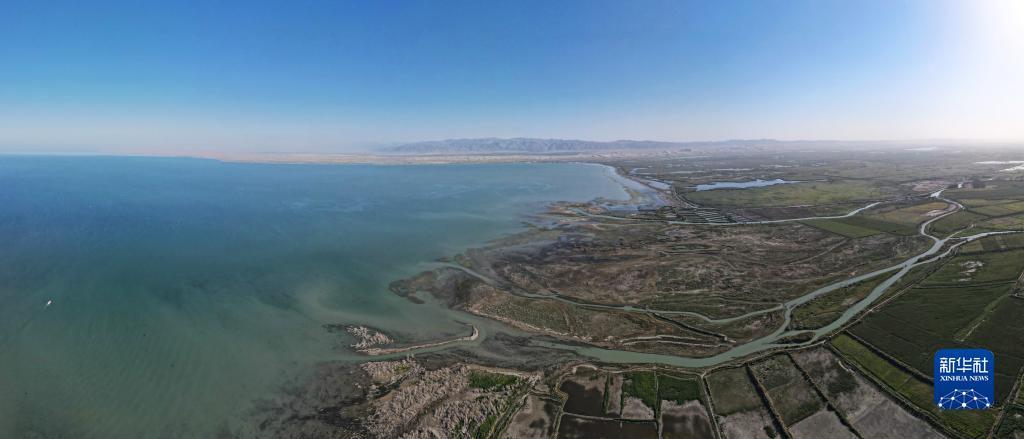 开都河汇入新疆博斯腾湖(8月31日摄,无人机全景照片)。