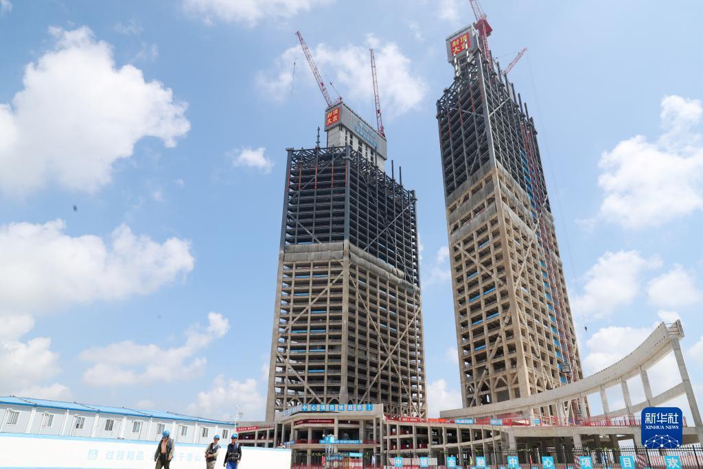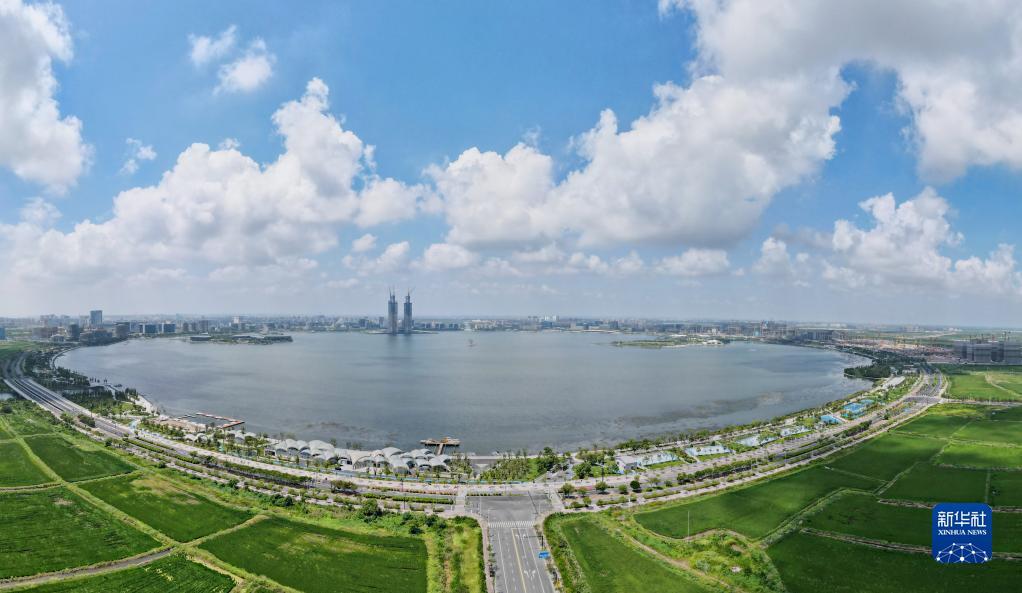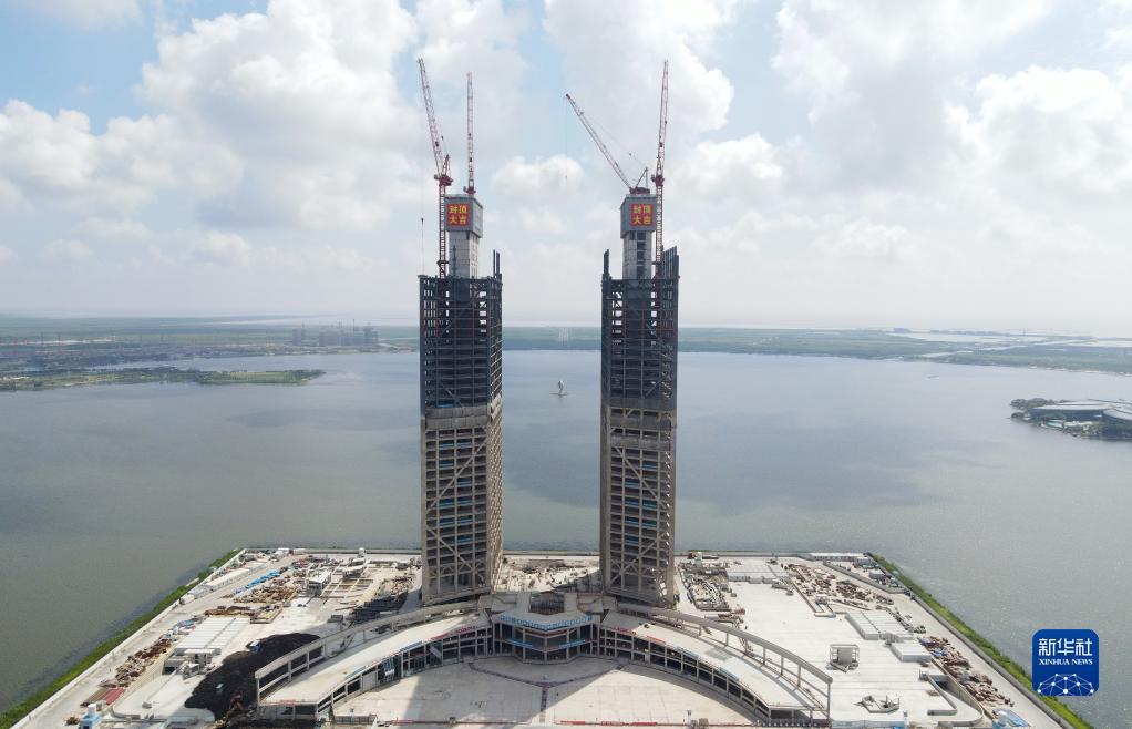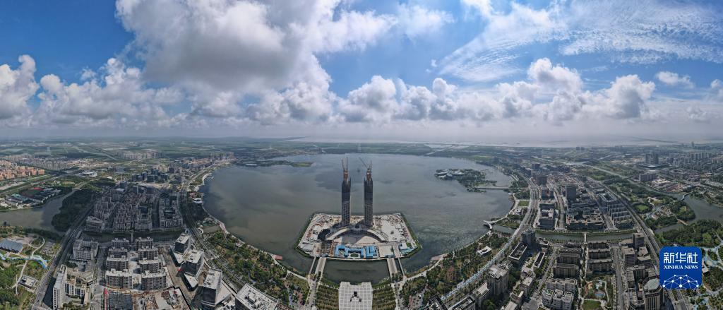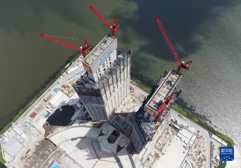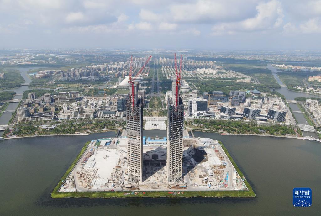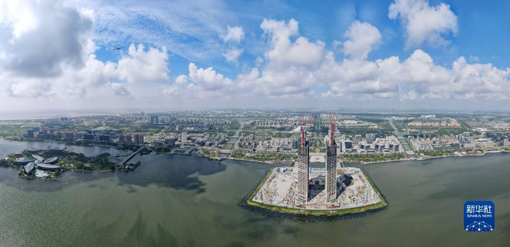 9月6日拍摄的从滴水湖东岸远眺临港西岛中银金融中心项目双子塔楼(无人机照片)。