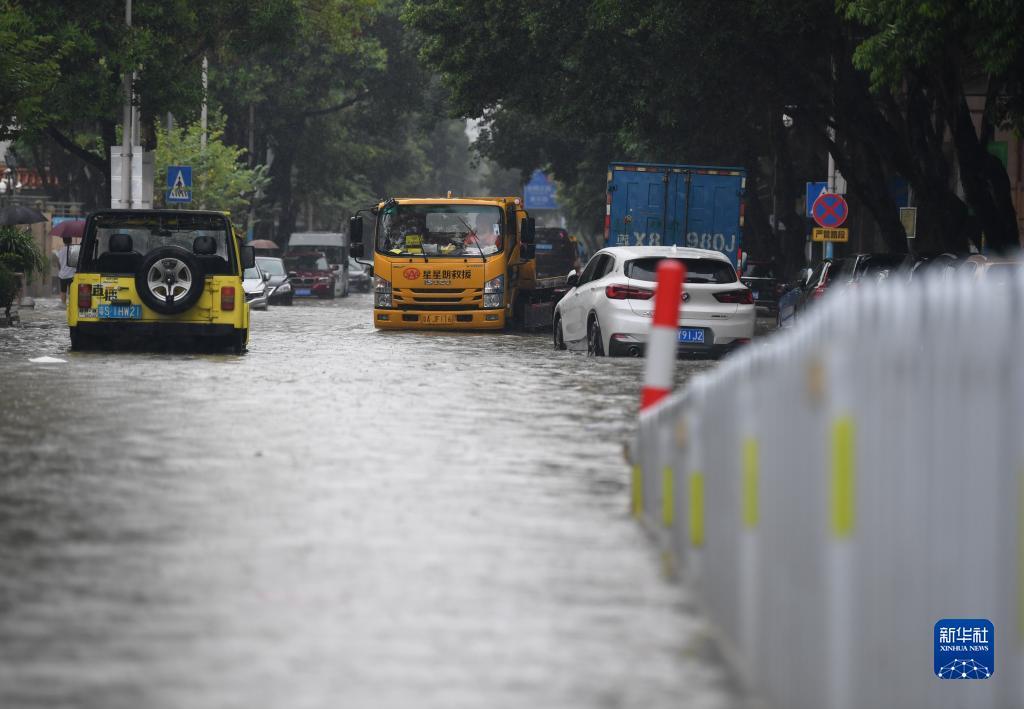 9月8日,在广州市番禺区繁华路,参与救援的拖车在积水中行进。