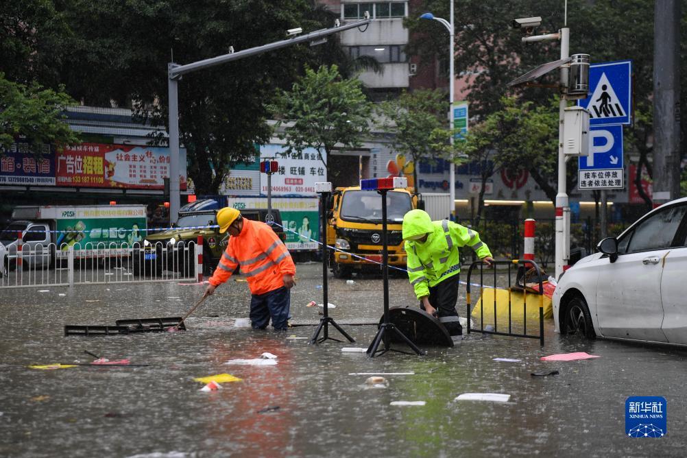 9月8日,在广州市番禺区市莲路,工作人员在清理排水设施。