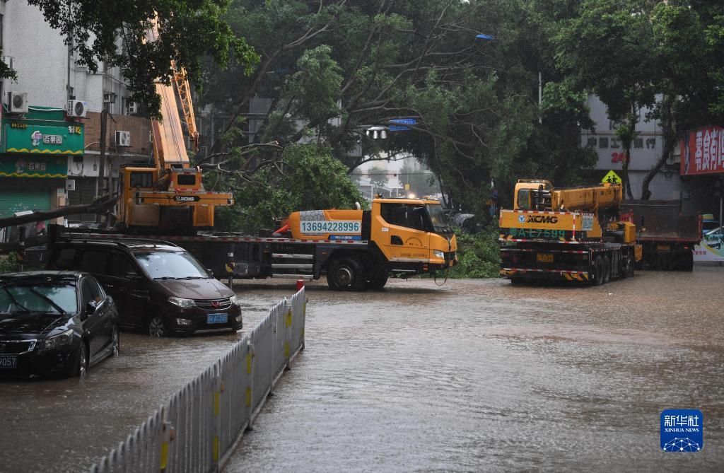 9月8日,在广州市番禺区康乐路,工作车辆在清理倒伏树木。