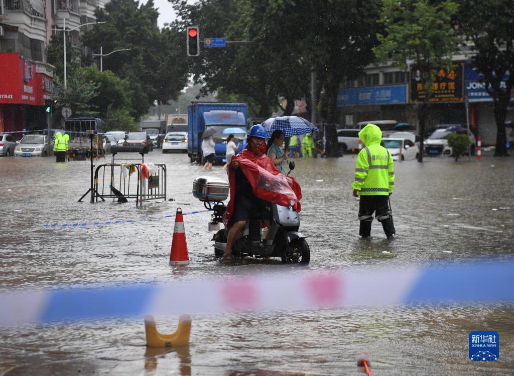 9月8日,在广州市番禺区繁华路,外卖骑手涉水行进。