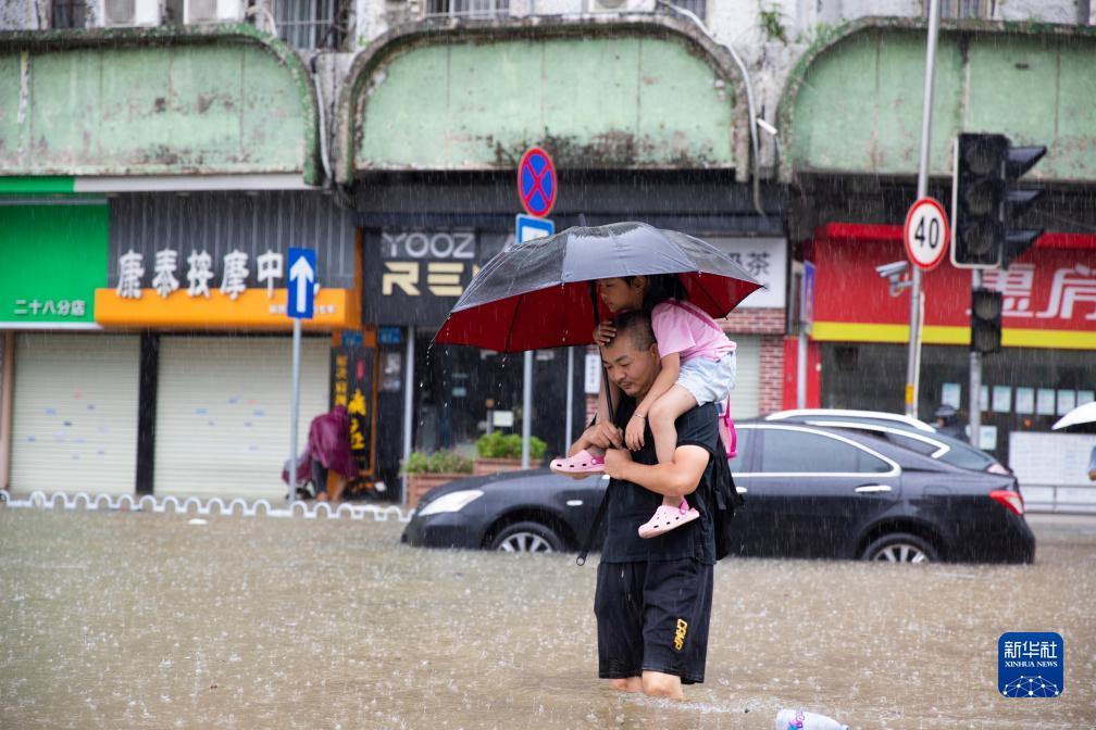 9月8日,在广州市番禺区市桥地铁站附近,家长背着孩子涉水前行。