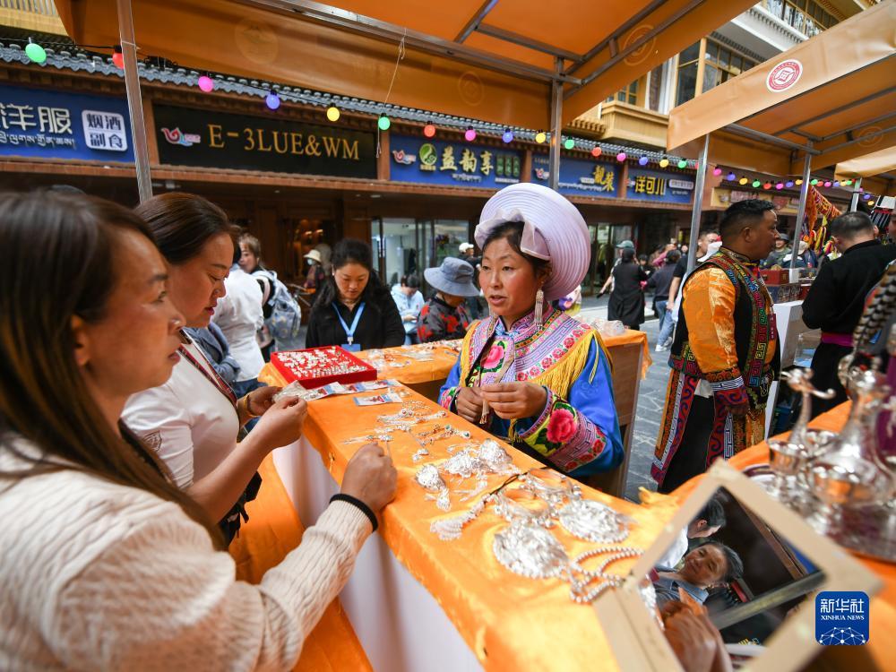 9月15日,在四川省阿坝藏族羌族自治州马尔康市嘉绒特色街区,游客在非遗集市上选购商品。
