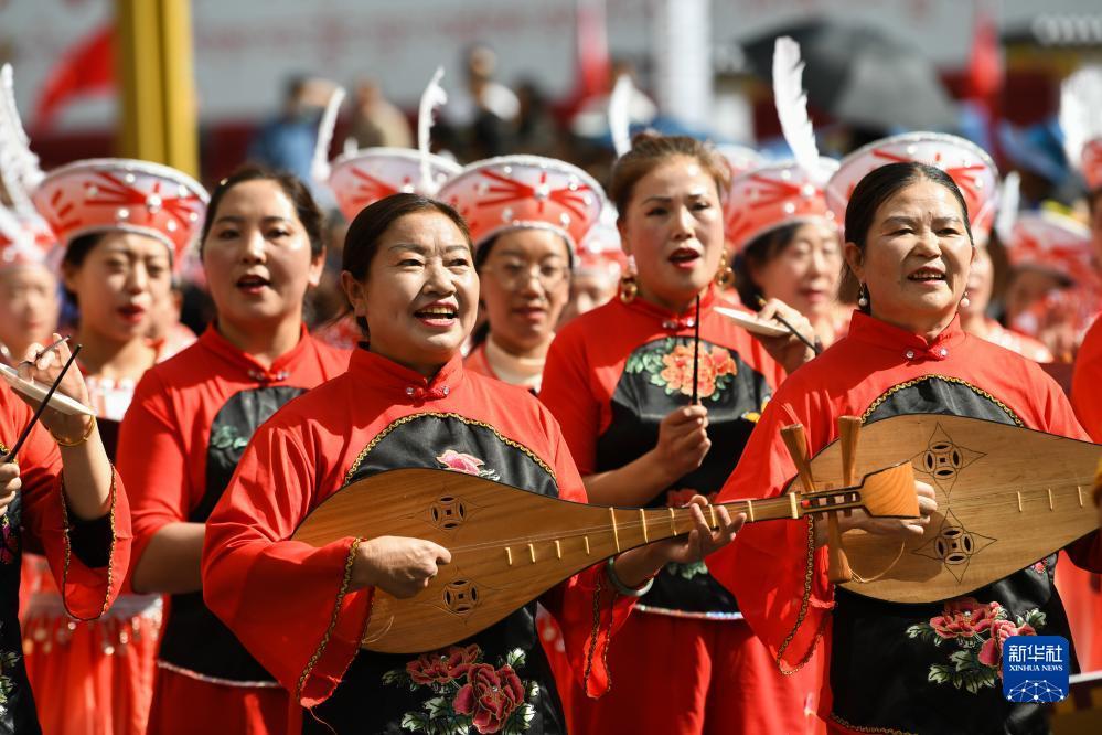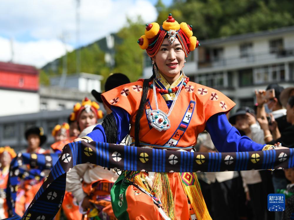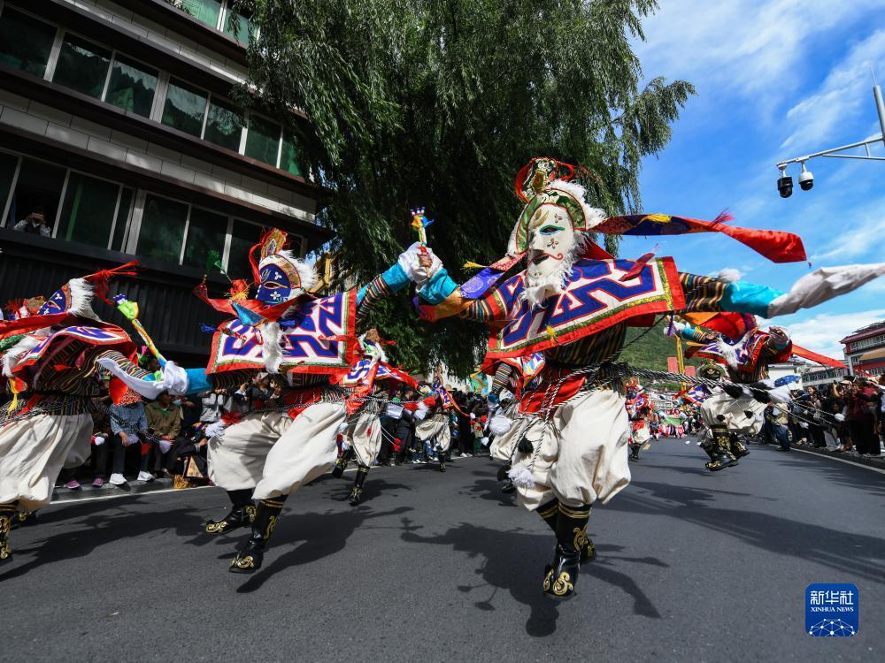 9月15日,在四川省阿坝藏族羌族自治州马尔康市,演员在街头表演非遗项目。