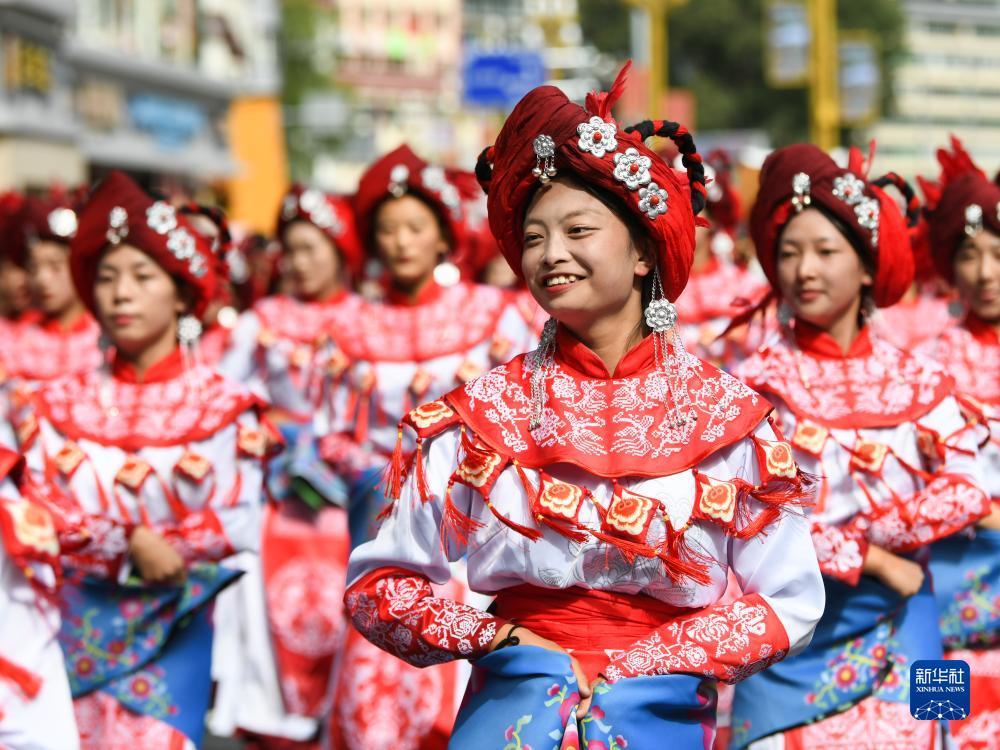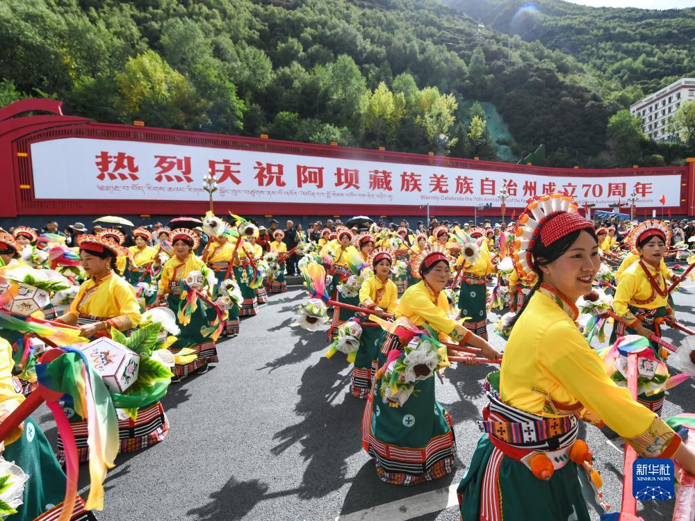 当日,来自四川省阿坝藏族羌族自治州13个县市的近千名演员在马尔康市街头开展巡游活动,展示阿坝州各个地区的非遗文化。据了解,非遗展演是阿坝州成立70周年系列庆祝活动之一。同时,当地还开展非遗集市、非遗晚会等活动。