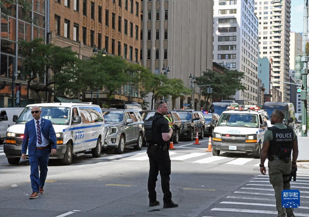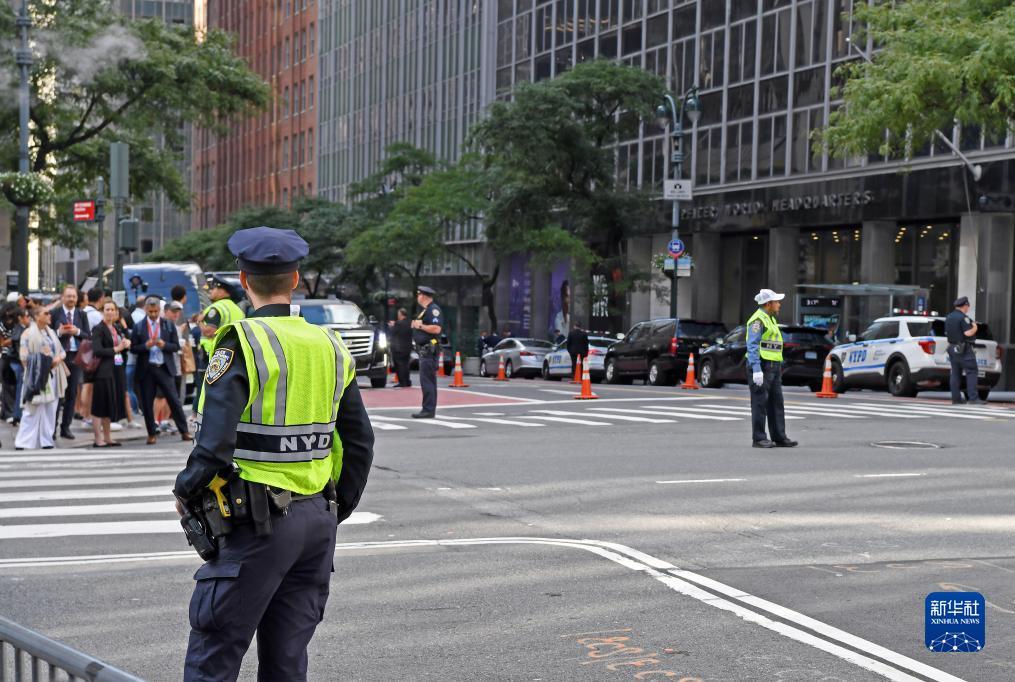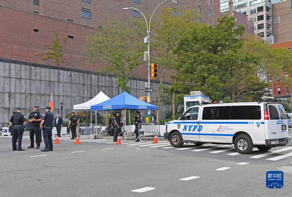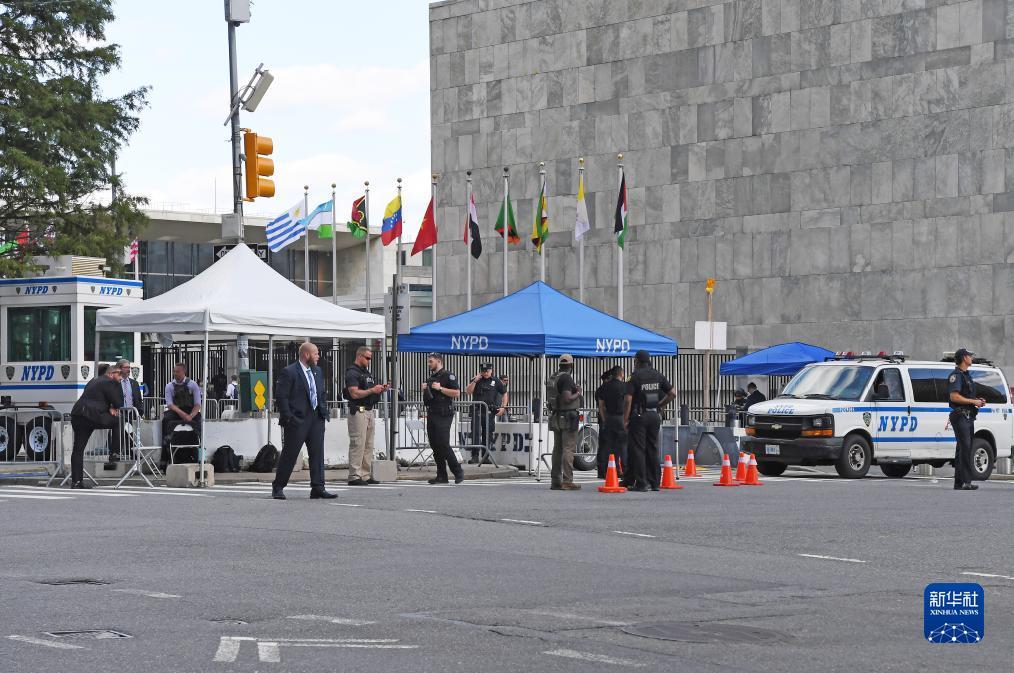 9月19日,在美国纽约,警察在联合国总部附近街头警戒。