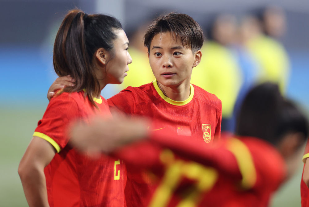 ↑中国队球员王霜(中上)与队友古雅沙在比赛前交流。新华社记者 贾浩成 摄