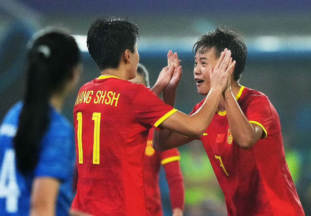 ↑中国队球员王霜(左)和中国队球员姚伟在比赛中庆祝进球。新华社记者 李一博 摄