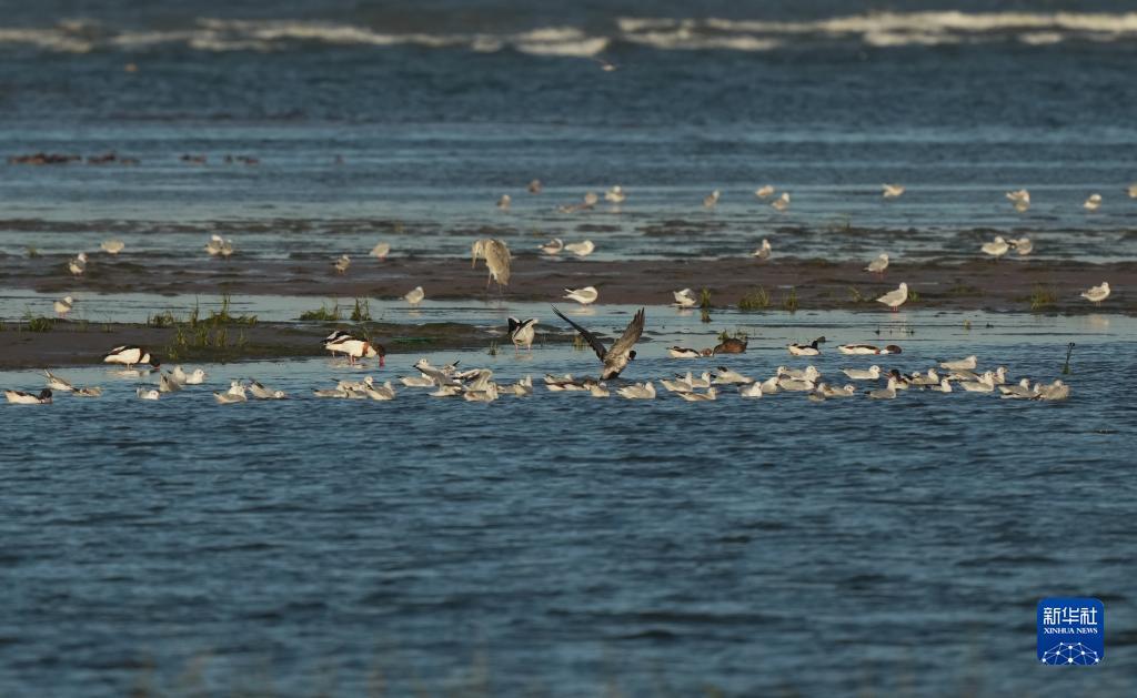 9月23日,一群水鸟在河北省秦皇岛市北戴河区沿海湿地觅食。