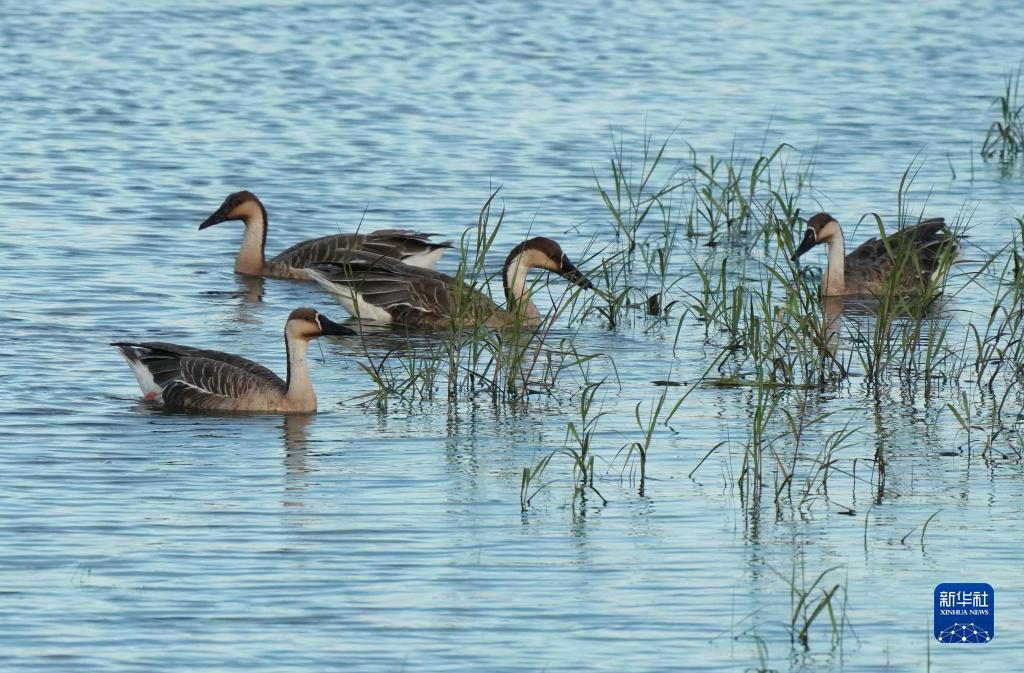 9月23日,四只鸿雁在河北省秦皇岛市北戴河区沿海湿地觅食。