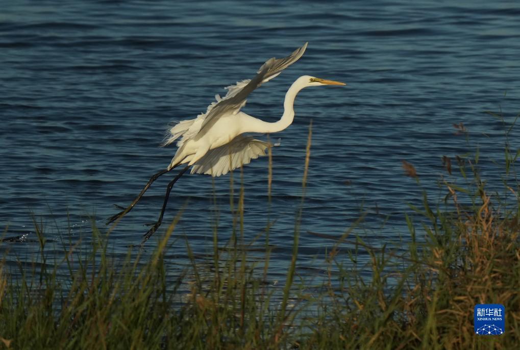9月23日,一只白鹭在河北省秦皇岛市北戴河区沿海湿地飞舞。