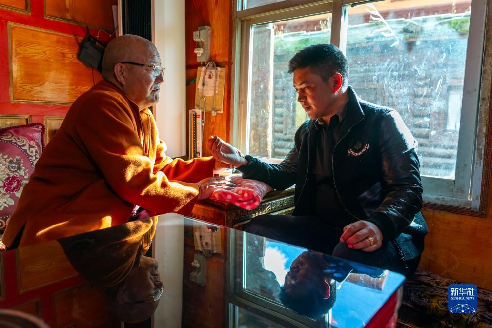 10月10日,在四川甘孜藏族自治州理塘县,囊索·嘉培藏医世家第八代传承人尖安益西(左)为当地群众诊疗。