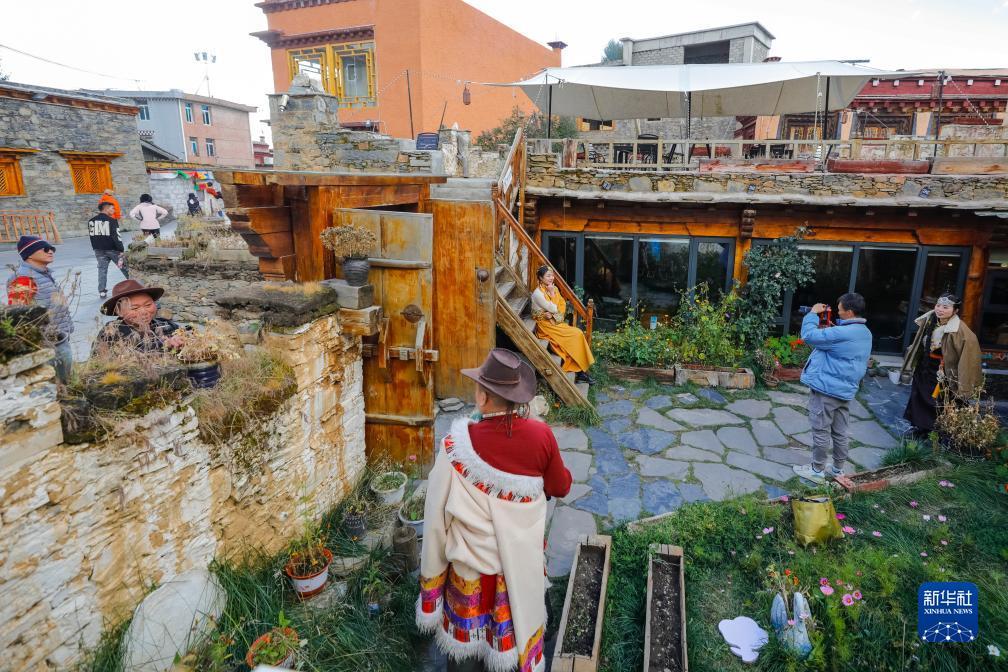 10月10日,在四川甘孜藏族自治州理塘县,游客在一家由藏族传统建筑改造而成的藏餐馆内拍摄。