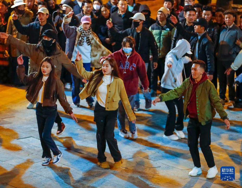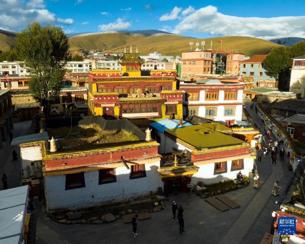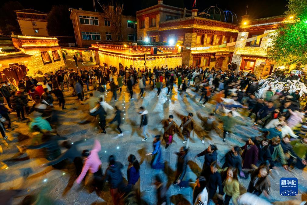 10月10日,人们在四川甘孜藏族自治州理塘县勒通古镇跳锅庄舞。
