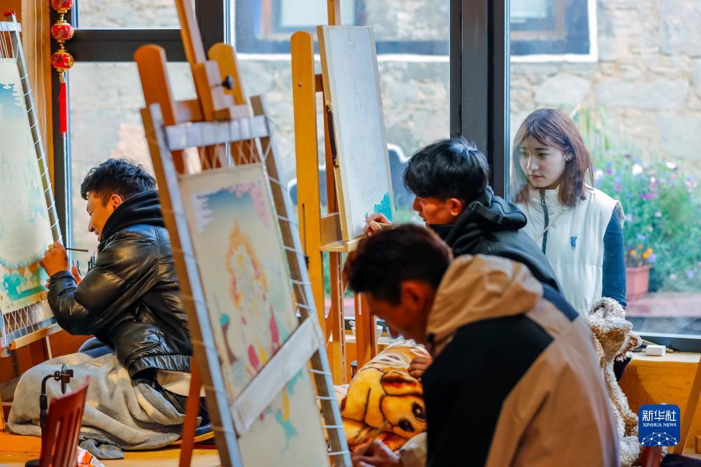 10月10日,在四川甘孜藏族自治州理塘县,年轻藏族艺术家在“唐卡馆”创作唐卡作品。
