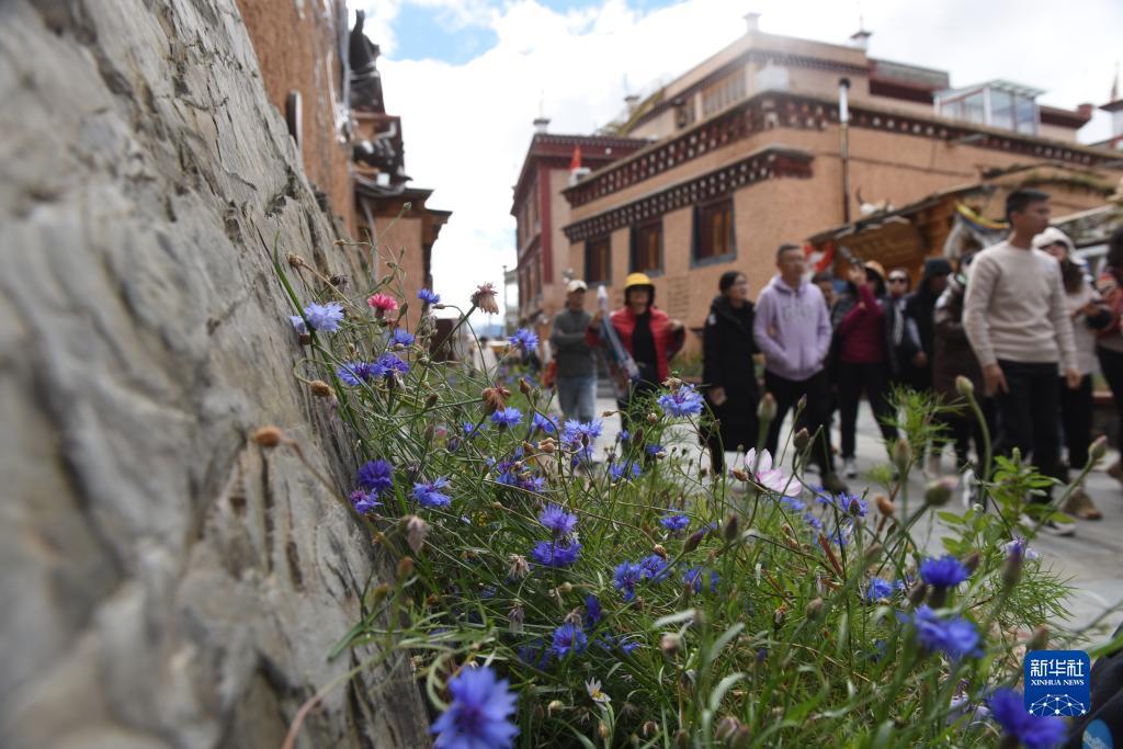 10月10日,在四川甘孜藏族自治州理塘县,游客在街头拍照。