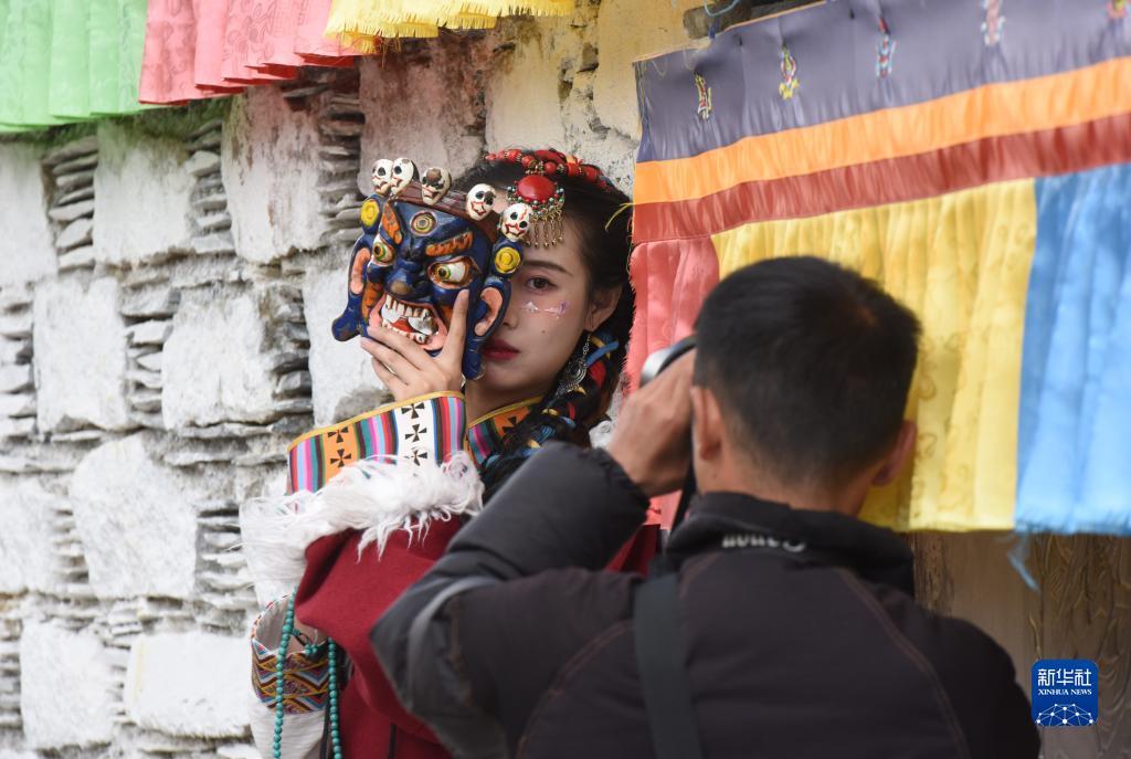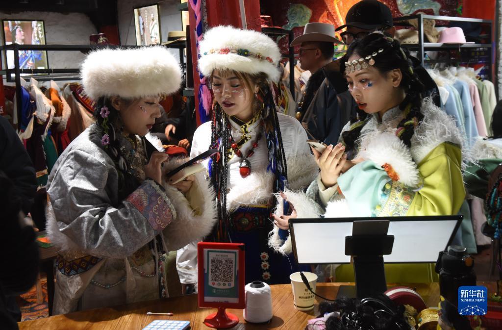 10月10日,在四川甘孜藏族自治州理塘县,游客体验藏式服饰。