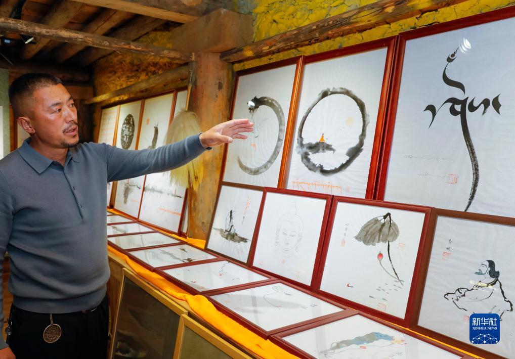 10月10日,在四川甘孜藏族自治州理塘县,藏族书法家昂旺曲批展示其将藏文书法与传统水墨画相结合创作的作品。