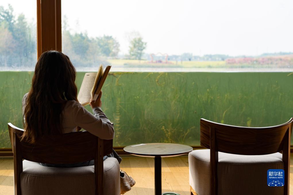 这是位于四川天府新区兴隆湖畔的中信书店一景(10月16日摄)。书店四周被碧水青草环绕,临湖一侧是一面玻璃幕墙,一直延伸至水下。