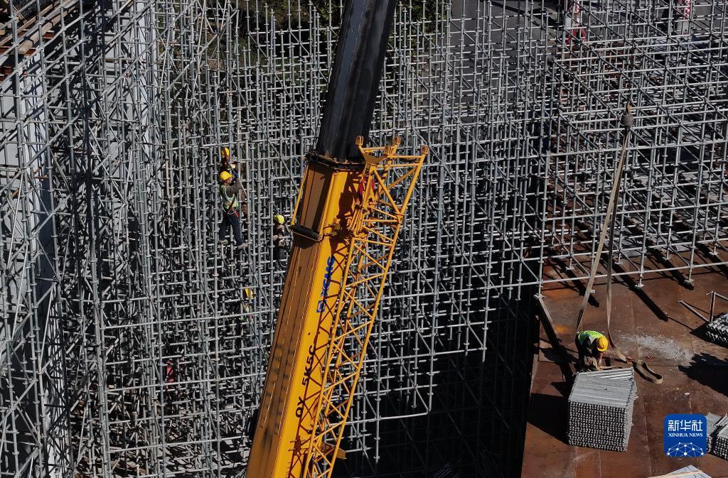 10月17日,工人在唐山滦州市内的秦唐高速公路建设工地施工(无人机照片)。