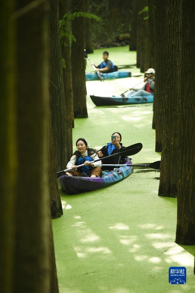 10月22日,游客在杉树林间泛舟。