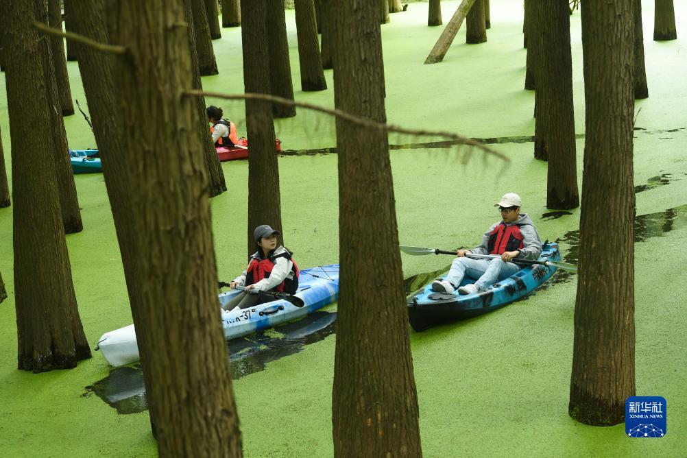 金秋时节,浙江杭州临安青山湖近百亩池杉和落羽杉混交林呈现“抹茶森林”景观,引得大批游客前来泛舟、漫步观光。这片浸没于水中的森林每到秋季就会铺满浮萍,浪漫景观宛如“绿野仙踪”。
