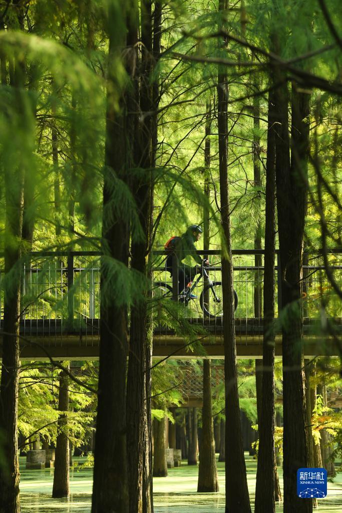 10月22日,游客在水上栈道骑行。