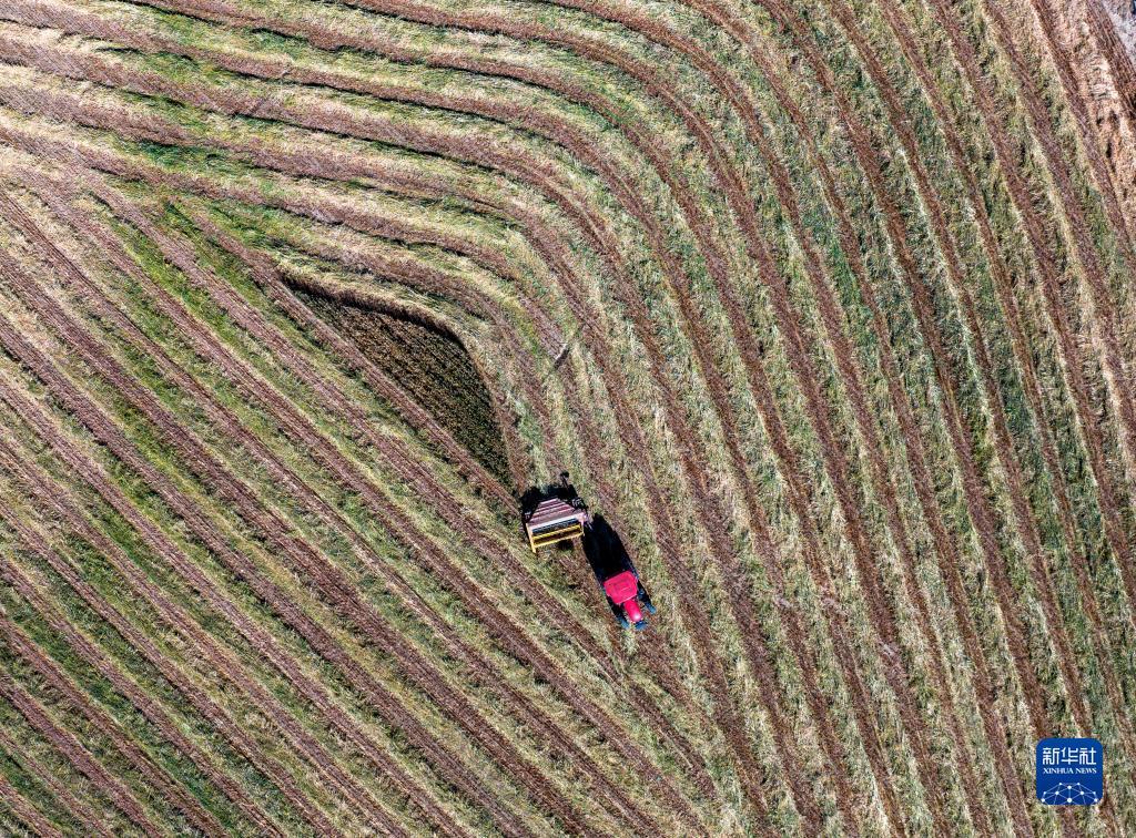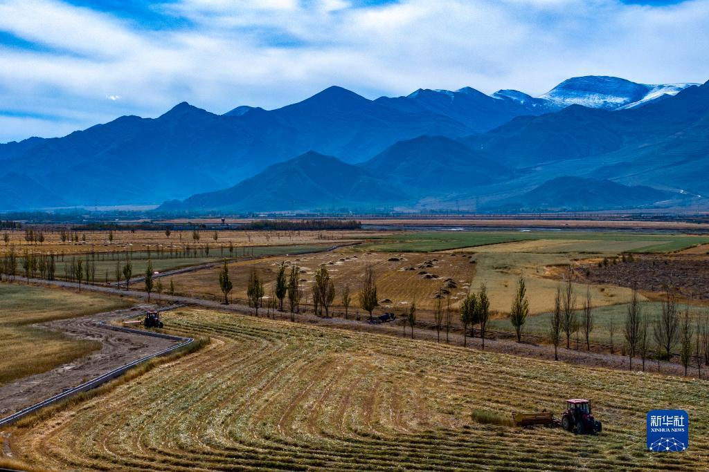 10月24日,村民驾驶农机在拉萨市林周县强嘎乡曲嘎强村收割牧草(无人机照片)。