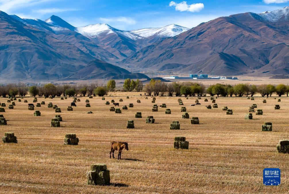 这是10月24日在拉萨市林周县强嘎乡曲嘎强村拍摄的已打包好的牧草(无人机照片)。