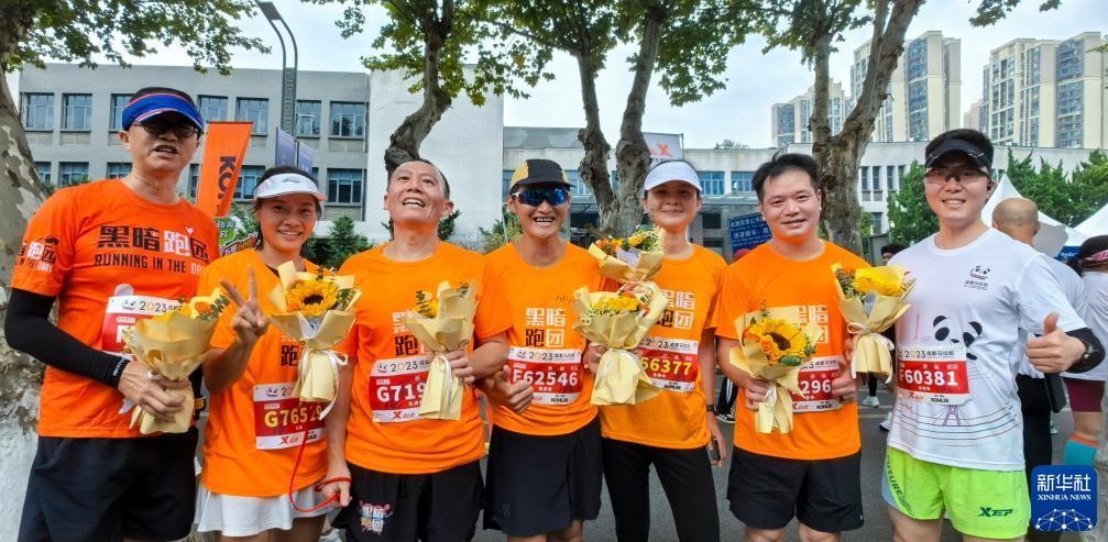 “黑暗跑团”视障跑者孔祥明(左三)完成2023成都马拉松半程比赛后与陪跑志愿者邹晓海(左一)、方琪(左二)、张志宏、吉丽华、苏航、白俊烽(右四至右一)合影(10月29日摄)。