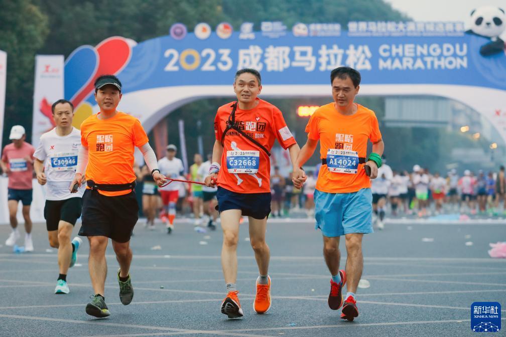 “黑暗跑团”陪跑志愿者覃锐(前左)、曾万军(前右)陪伴视障跑者李中书参加2023成都马拉松比赛(10月29日摄)。新华社记者 沈伯韩 摄