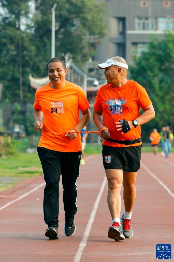 在四川大学华西校区运动场,“黑暗跑团”志愿者谢蜀贤(右)用陪跑绳带着视障跑者王克泉训练(10月28日摄)。新华社记者 沈伯韩 摄