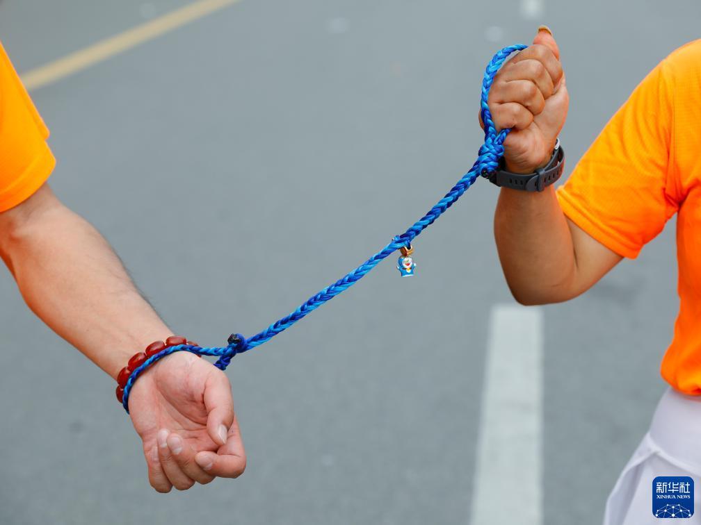 参加2023成都马拉松全程比赛的“黑暗跑团”视障跑者韩宇(左)与他的陪跑志愿者通过一根陪跑绳联结在一起(10月29日摄)。新华社记者 沈伯韩 摄