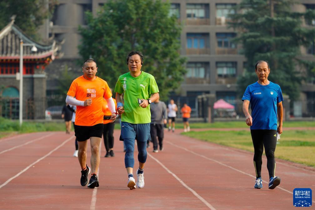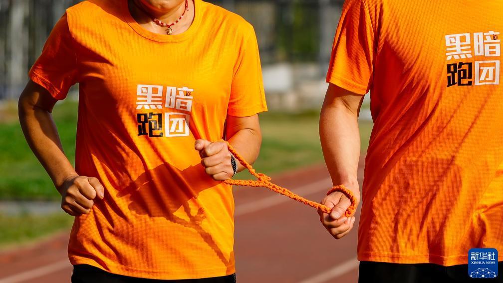 在四川大学华西校区运动场,“黑暗跑团”志愿者用陪跑绳带着视障跑者张华(前左一)训练(10月28日摄)。新华社记者 沈伯韩 摄