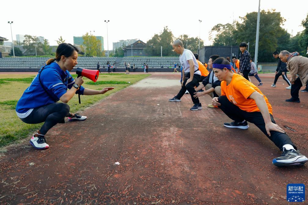 在四川大学华西校区运动场,“黑暗跑团”志愿者陈霞(左一)带领视障跑者和陪跑志愿者在训练前进行热身活动(10月28日摄)。新华社记者 沈伯韩 摄