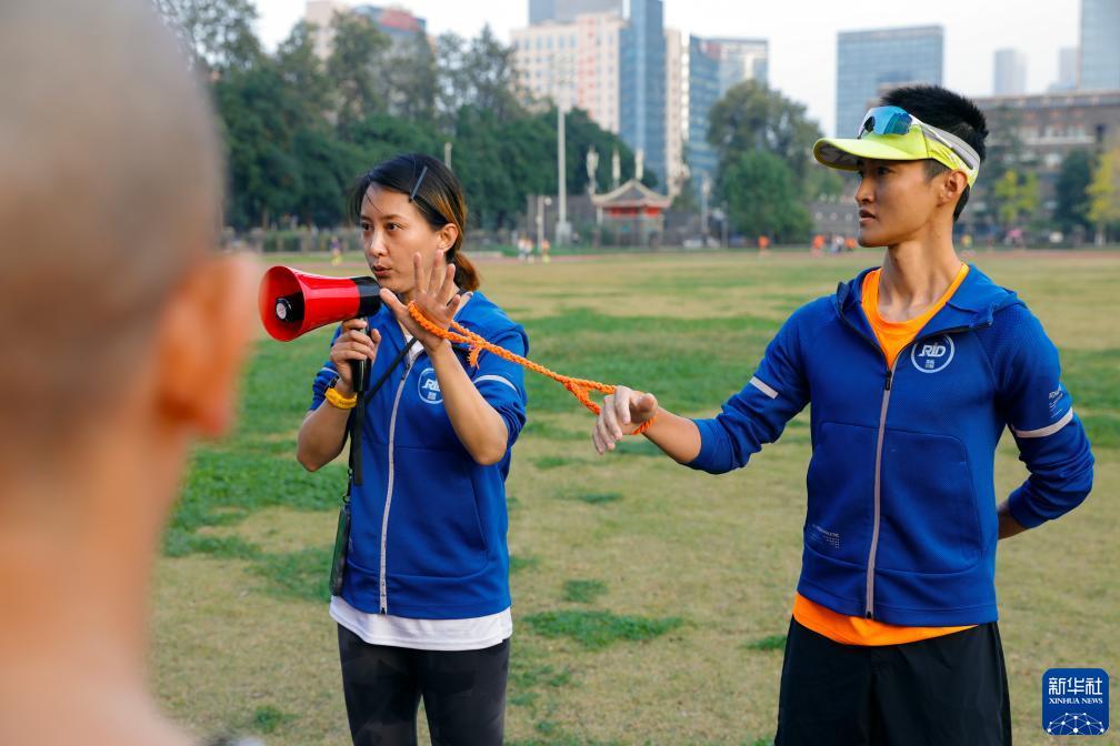 在四川大学华西校区运动场,“黑暗跑团”志愿者陈霞(左)和张志宏向新加入的陪跑志愿者展示如何使用陪跑绳(10月28日摄)。新华社记者 沈伯韩 摄