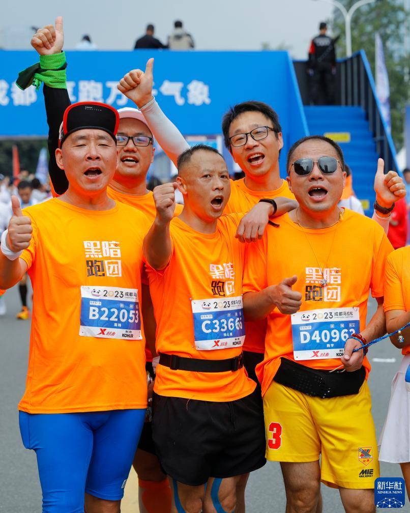 “黑暗跑团”视障跑者陈永强(中)、韩宇(右一)完成2023成都马拉松全程比赛后与陪跑志愿者欢呼庆祝(10月29日摄)。新华社记者 沈伯韩 摄