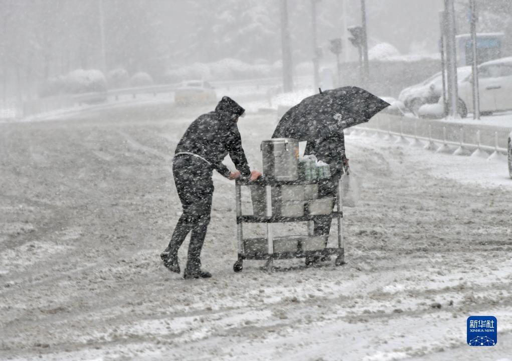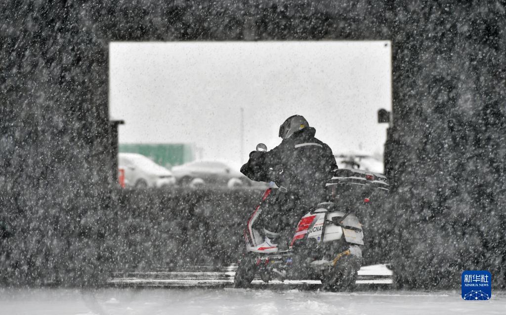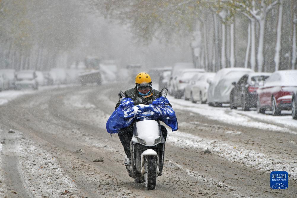 11月6日,在沈阳市浑南区,外卖员在雪中送外卖。