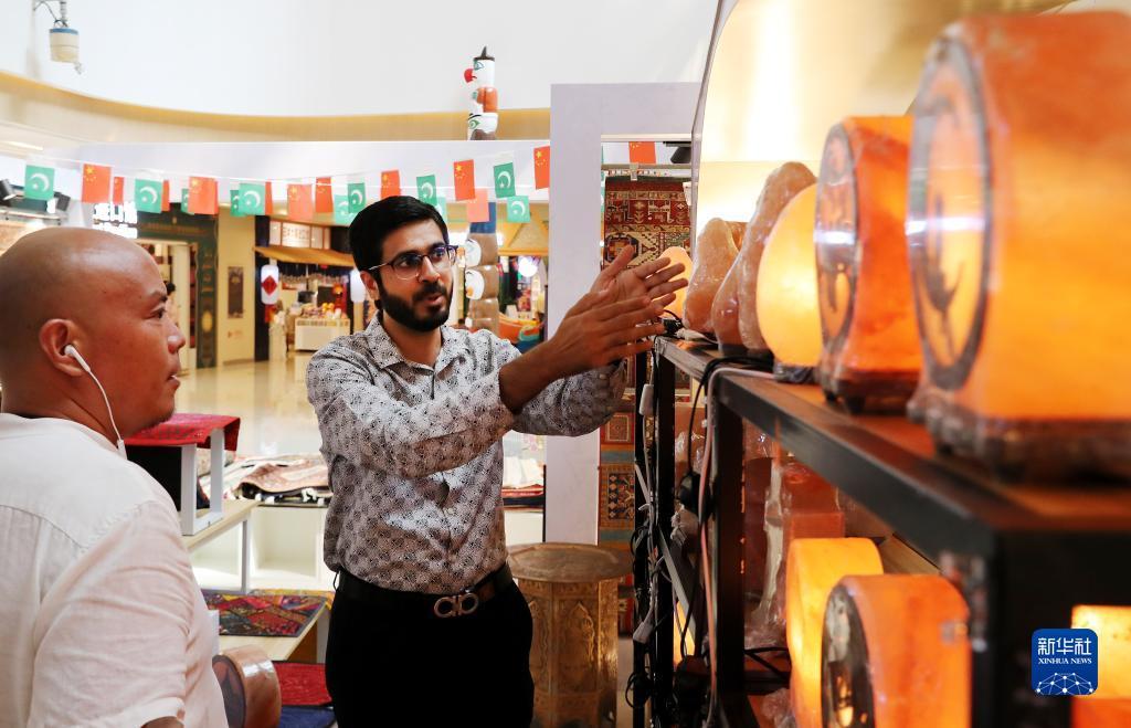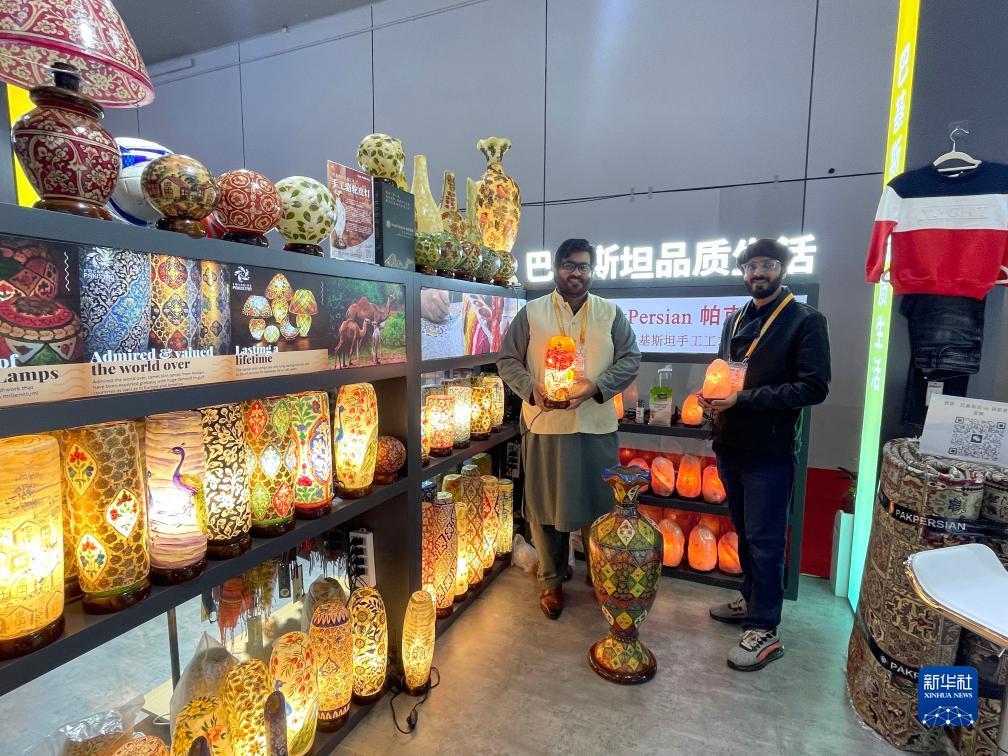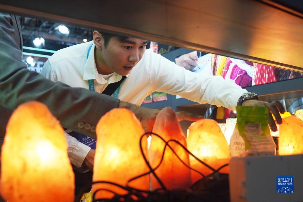 巴基斯坦兄弟哈比和李明算是进博会的“老朋友”了。他们第一次参展是2021年第四届中国国际进口博览会。在当时为期6天的展期上,二人共销售了一整个集装箱的盐灯。乘着“进博”的东风,会后的两个月,又在常设展里卖出两个集装箱约5万个盐灯。