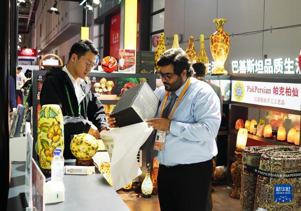 11月6日,在第六届进博会食品及农展品展区,参观者在李明(右)的引导下,扫描二维码关注巴基斯坦手工艺品淘宝店铺。