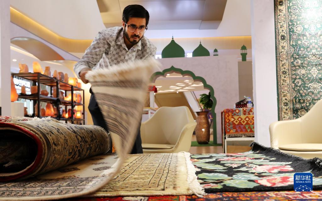 哈比在位于上海绿地贸易港的商铺内整理地毯(2021年9月7日摄)。