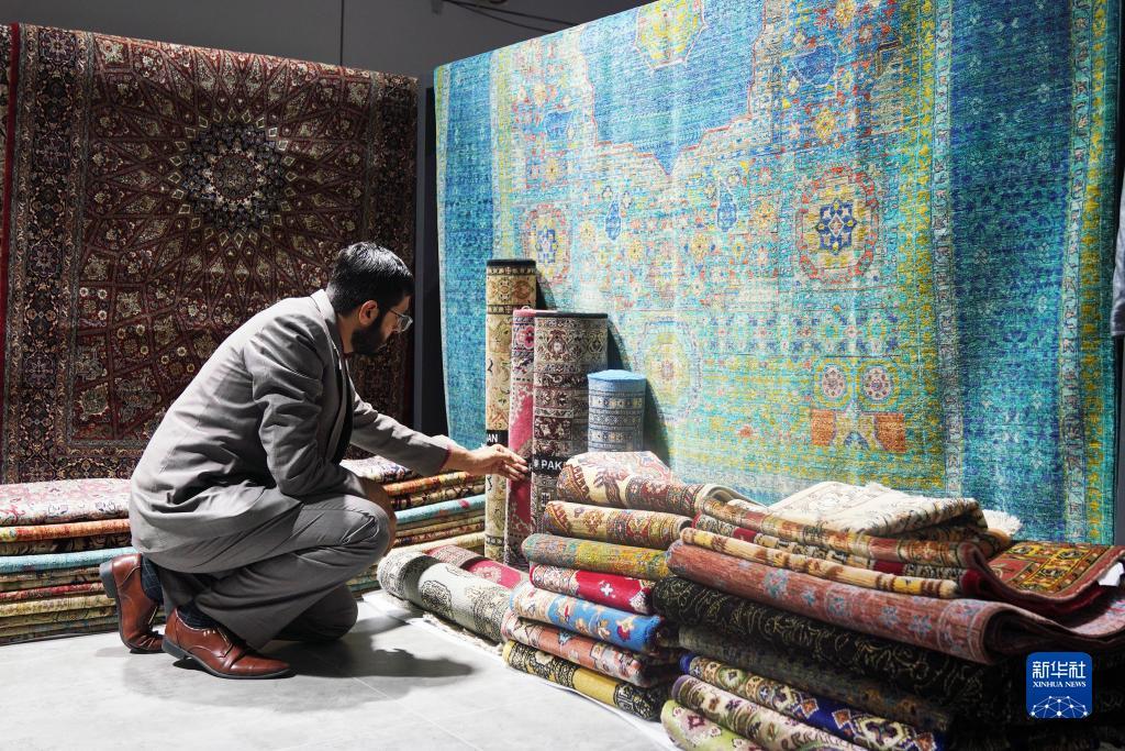 11月6日,在第六届进博会食品及农展品展区,哈比在整理摊位内的手工地毯。