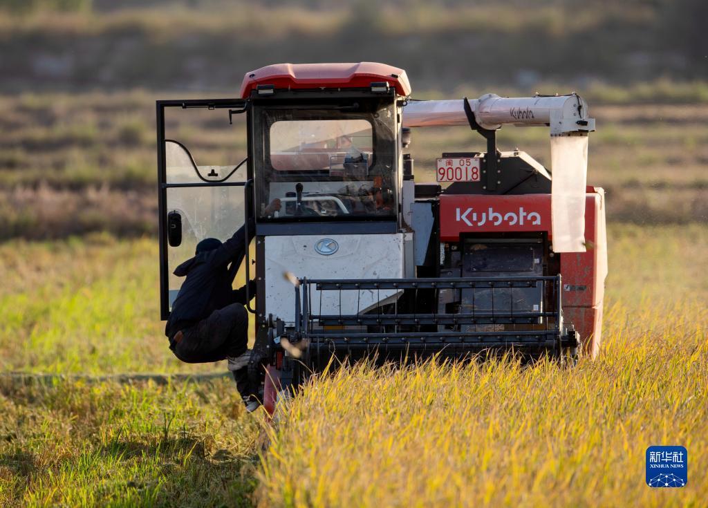 连日来,在福建省石狮市湿地公园粮食规模化种植示范基地,金黄的晚稻成块连片。趁着晴好天气,水稻种植户们忙着收割水稻。