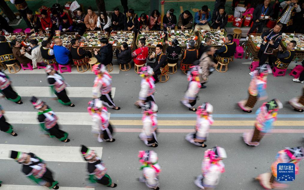 11月19日,绿春县哈尼族群众与游客一起品尝哈尼长街古宴,巡游展演队伍从一旁经过(无人机照片)。